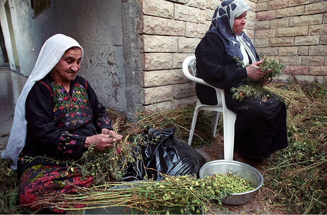 Beyond modern fashion designers, traditional embroidery still holds sway among elderly Palestinian grandmas and aunties. Here, two women wearing traditional dress help harvest hummus (chickpeas or garbanzo beans) at their home in Bethlehem. (Shutterstock/Ryan Rodrick Beiler)