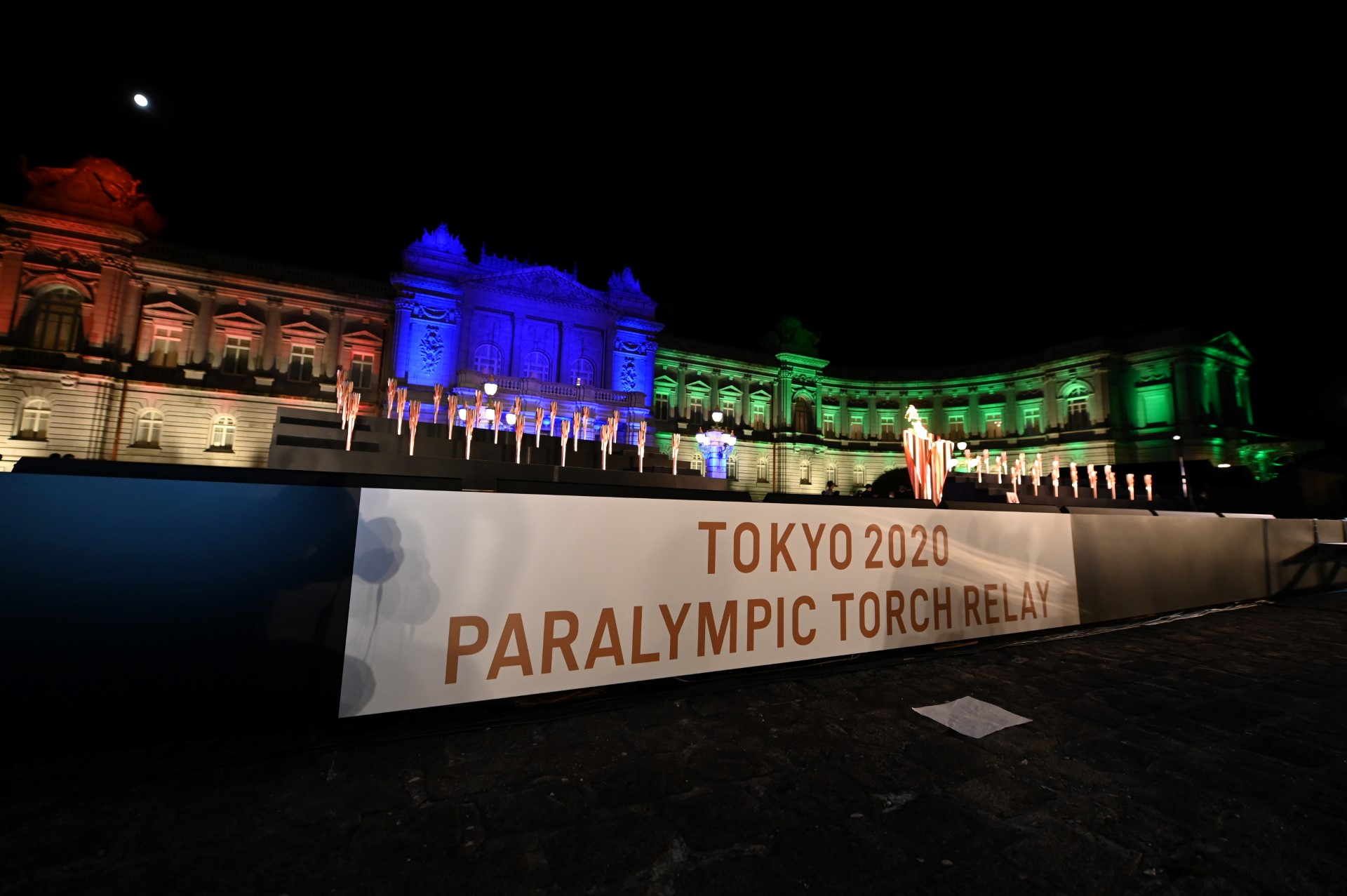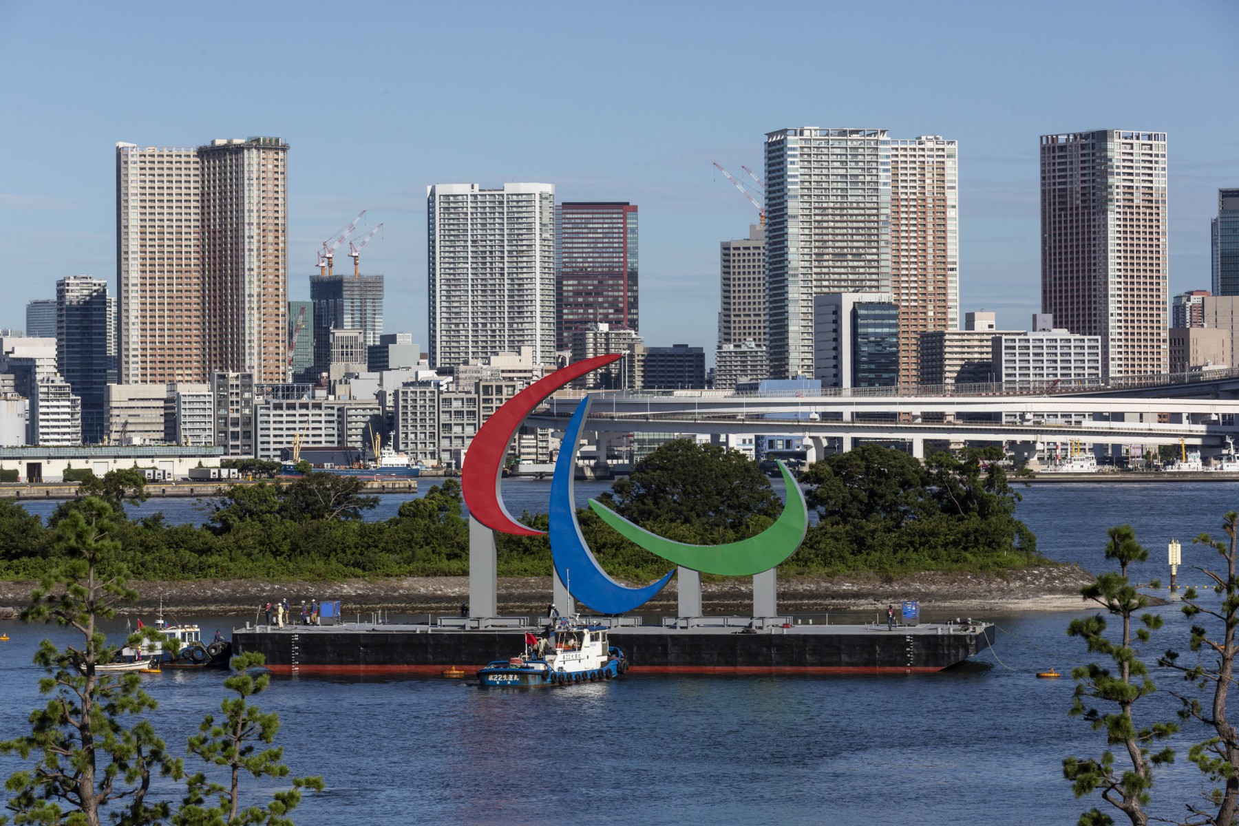 A huge version of the red, blue, and green Paralympic symbol was brought to the Tokyo bay area on a barge, replacing the five rings which were towed away after the Olympics.