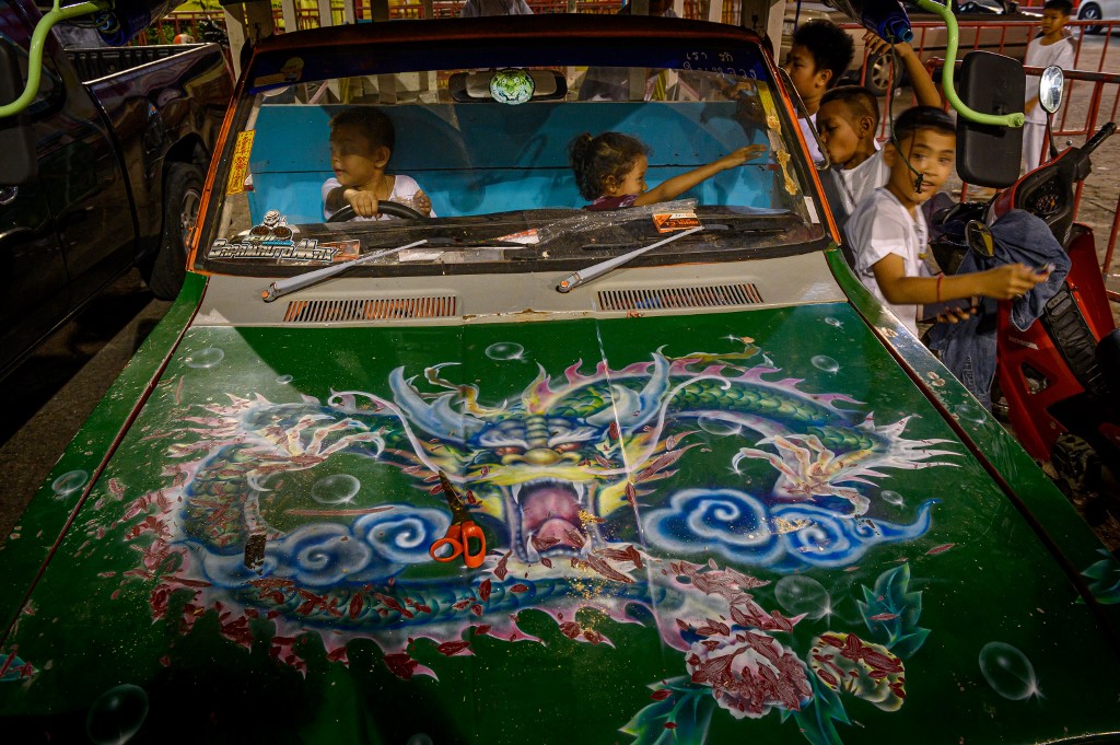 Children play in a car parked next to a Chinese shrine during the annual Vegetarian Festival in Phuket on October 2, 2019. Mladen ANTONOV / AFP