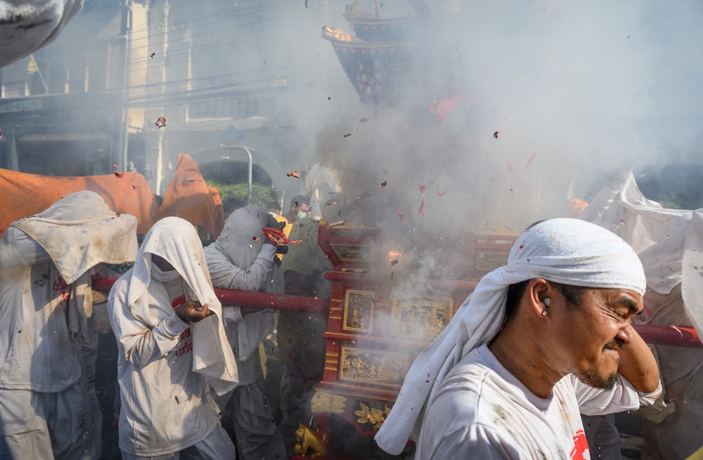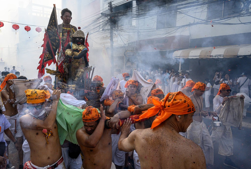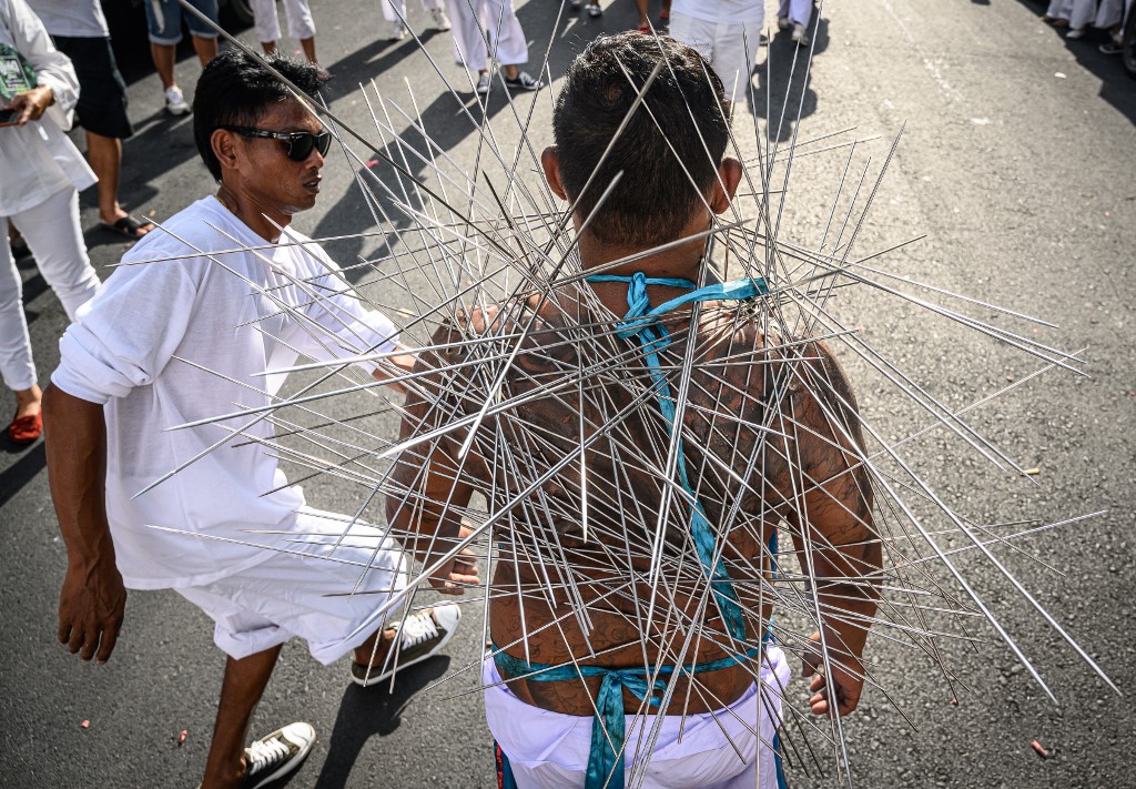The festival begins on the first evening of the ninth lunar month and lasts for nine days, with many religious devotees slashing themselves with swords, piercing their cheeks with sharp objects and committing other painful acts to purify themselves, taking on the sins of the community. Mladen ANTONOV / AFP