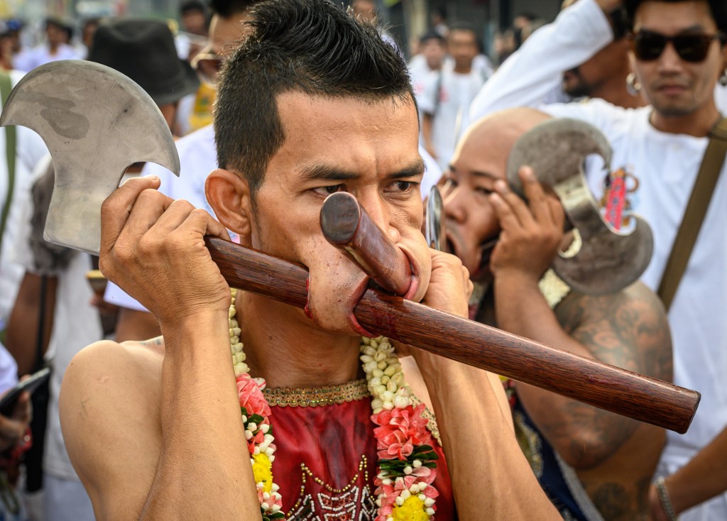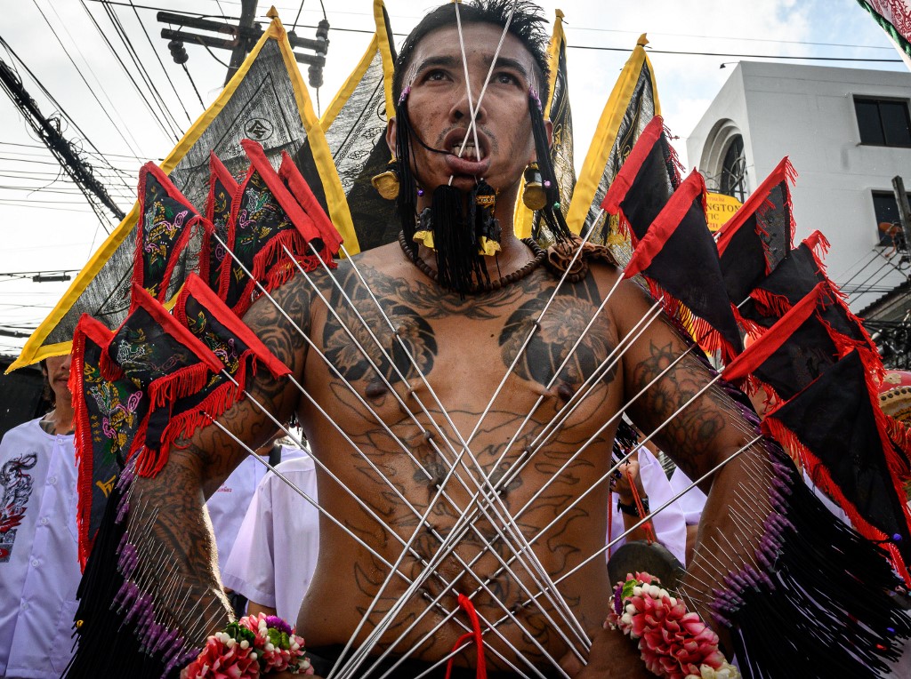 A devotee of a Chinese shrine with multiple needles pierced through his cheeks takes part in a procession during the annual Vegetarian Festival in Phuket on October 4, 2019. Mladen ANTONOV / AFP