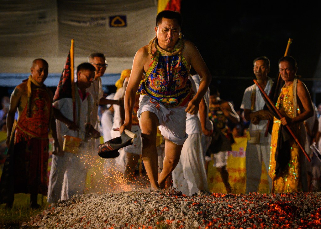 A devotee of a Chinese shrine walks on ambers during the annual Vegetarian Festival in Phuket on October 4, 2019.Mladen ANTONOV / AFP