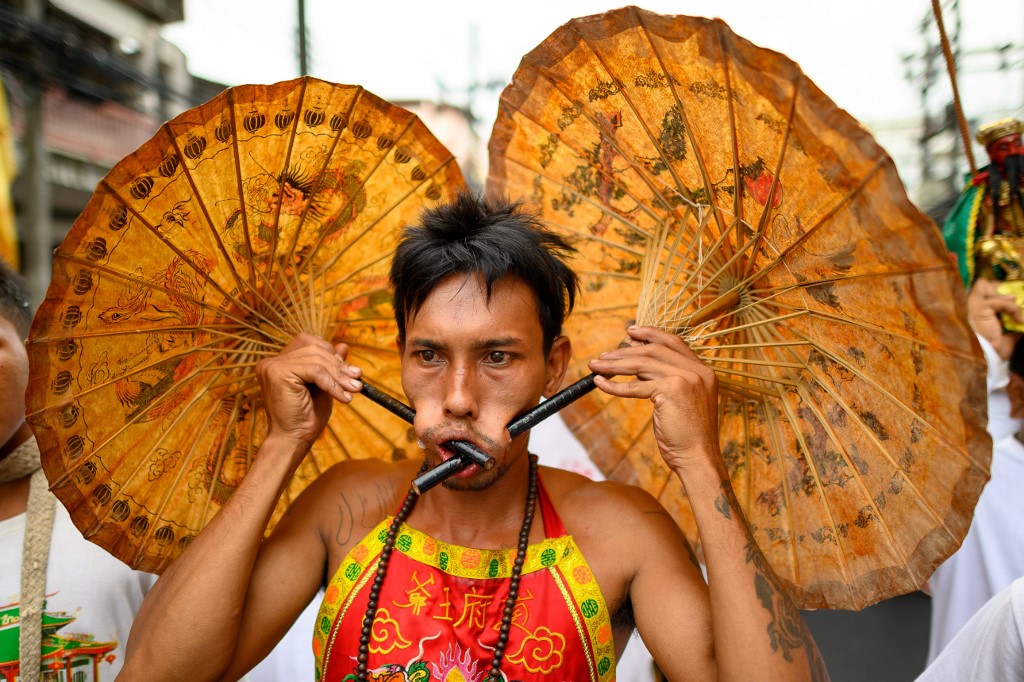A devotee of a Chinese shrine with two umbrellas pierced through his cheeks takes part in a procession during the annual Vegetarian Festival in Phuket on October 5, 2019. Mladen ANTONOV / AFP