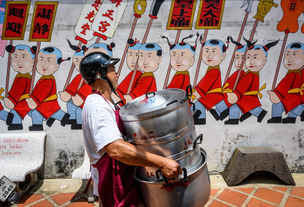 A volunteer carries empty pots at a Chinese shrine during the annual Vegetarian Festival in Phuket on October 5, 2019. Mladen ANTONOV / AFP