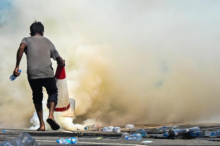 A demonstrators tries to douse a tear gas canister fired by police to disperse Higher National Diploma (HND) students protesting to demand the resignation of Sri Lanka's President Gotabaya Rajapaksa over the country's crippling economic crisis, in Colombo on May 21, 2022. (Photo by ISHARA S. KODIKARA / AFP)
