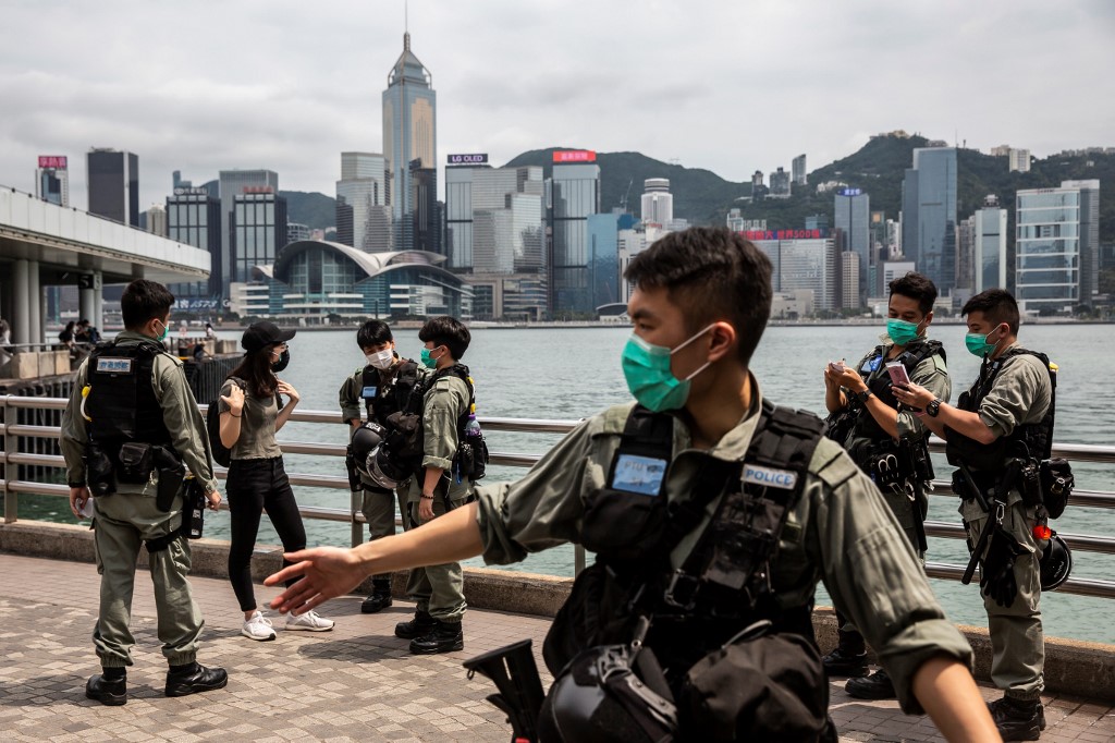 Police officers patrol the Tsim Sha Tsui waterfront where protests by pro-democracy demonstrators calling for the citys independence were scheduled to take place in Hong Kong on May 10, 2020. ISAAC LAWRENCE / AFP