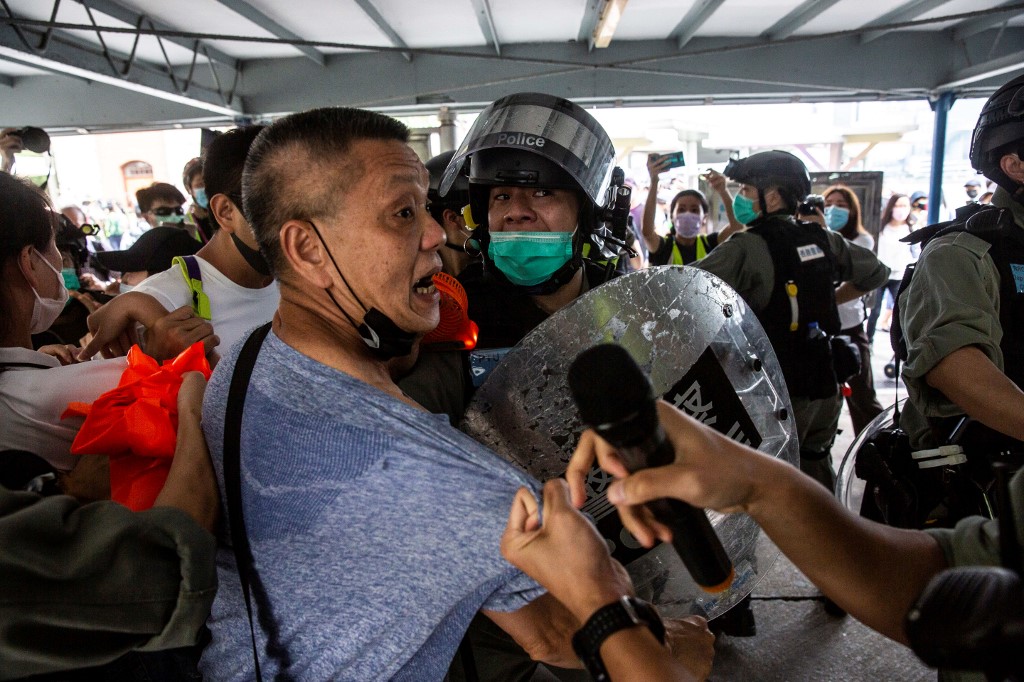 Police officers clash with a pro-democracy demonstrator (C) in the Tsim Sha Tsui waterfront during a pro-democracy protest calling for the city's independence in Hong Kong on May 10, 2020. ISAAC LAWRENCE / AFP