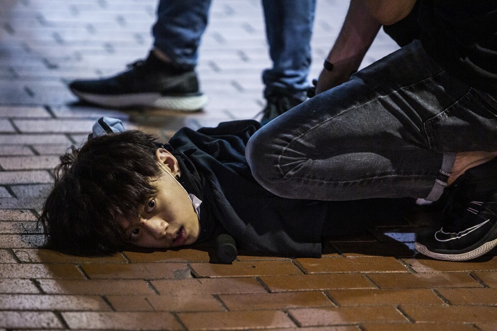 Undercover police arrest and handcuff a pro-democracy demonstrator (C) during a pro-democracy protest calling for the city's independence in Mong Kok district of Hong Kong on May 10, 2020. ISAAC LAWRENCE / AFP