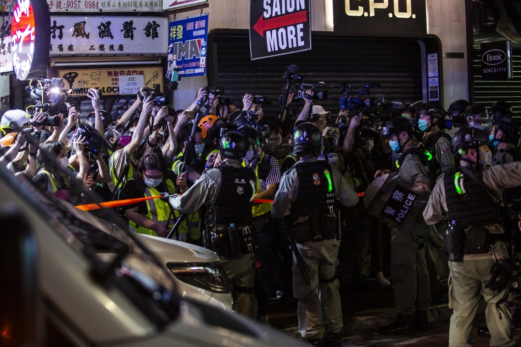 Riot police hold back members of the press during a police operation to arrest pro-democracy demonstrators during a protest calling for the city's independence in Mong Kok district of Hong Kong on May 10, 2020. ISAAC LAWRENCE / AFP