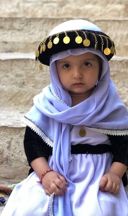 Photo of little Yezidi child in Yezidi traditional clothes in Lalish Temple the holiest Yezidi Religious Site in the world (Twitter)