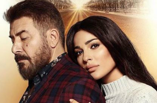 Miss Lebanon 2004 and actress Nadine Njeim is leaning on Syrian actor Abed Fahed's back in the poster of "Tariq" (The Way) (Source: nadine.nassib.njeim - Instagram)
