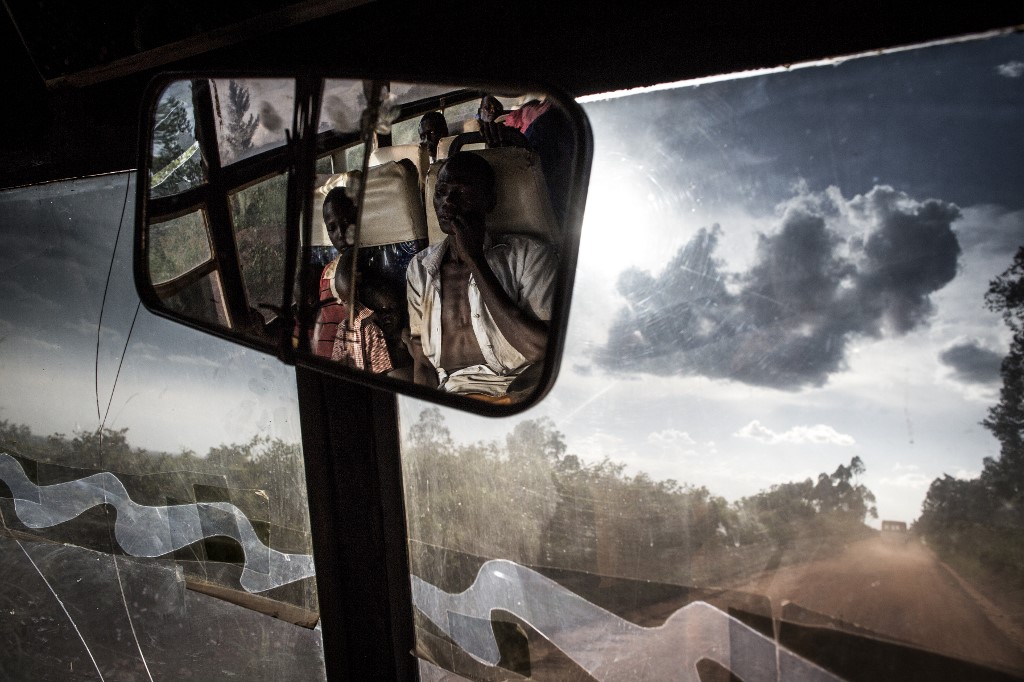 South Sudanese refugees transported by bus from the border of South Sudan to a refugees settlement site in Democratic republic of the Congo (DRC) are seen in the rear-view mirror of the bus JOHN WESSELS / AFP