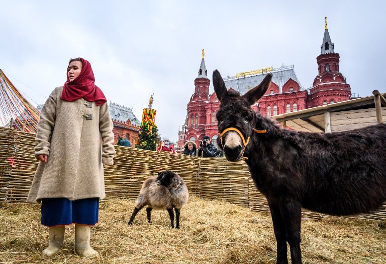 A woman dressed in a traditional costume cares for farm animals in an enclosure set up for the Shrovetide spring festival outside the Kremlin in Moscow on March 01, 2019. Mladen ANTONOV / AFP
