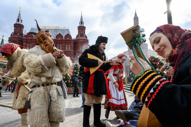 Performers dressed in traditional costumes sing and dance during the Shrovetide spring festival outside the Kremlin in Moscow on March 01, 2019. Mladen ANTONOV / AFP