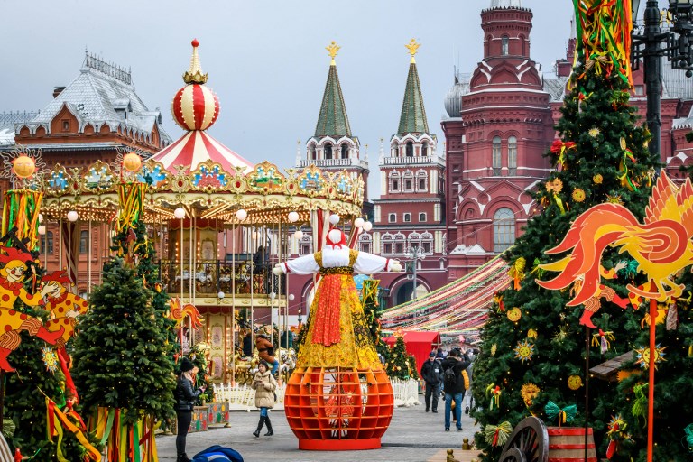 A picture taken on March 1, 2019 shows the decorations for the Shrovetide spring festival outside the Kremlin in Moscow. Mladen ANTONOV / AFP
