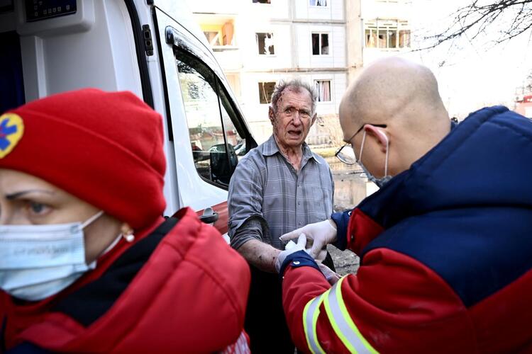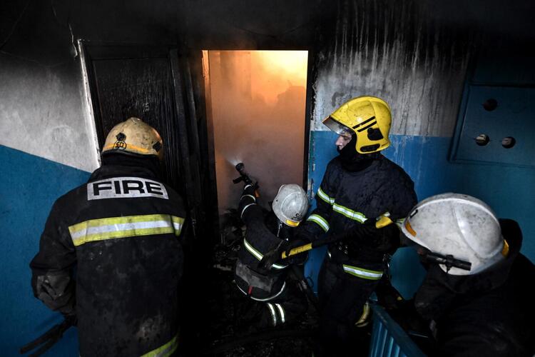 Firefighters work on a fire in a building after bombings on the eastern Ukraine town of Chuhuiv on February 24, 2022, as Russian armed forces are trying to invade Ukraine from several directions, using rocket systems and helicopters to attack Ukrainian position in the south, the border guard service said. Russia's ground forces on Thursday crossed into Ukraine from several directions, Ukraine's border guard service said, hours after President Vladimir Putin announced the launch of a major offensive. Russian tanks and other heavy equipment crossed the frontier in several northern regions, as well as from the Kremlin-annexed peninsula of Crimea in the south, the agency said. (Photo by Aris Messinis / AFP)