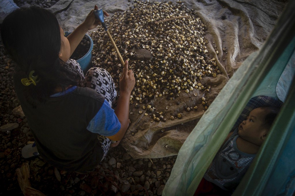 This picture taken on February 12, 2019 shows Putri (not her real name), who got married in 2017, breaking candlenuts under her parents' stilt house while caring for her child (R) in the village of Pokkang in Mamuju, West Sulawesi. Child marriage has long been common in traditional communities from the Indonesian archipelago to India, Pakistan and Vietnam, but numbers had been decreasing as charities made inroads by encouraging access to education and women's health services. YUSUF WAHIL / AFP