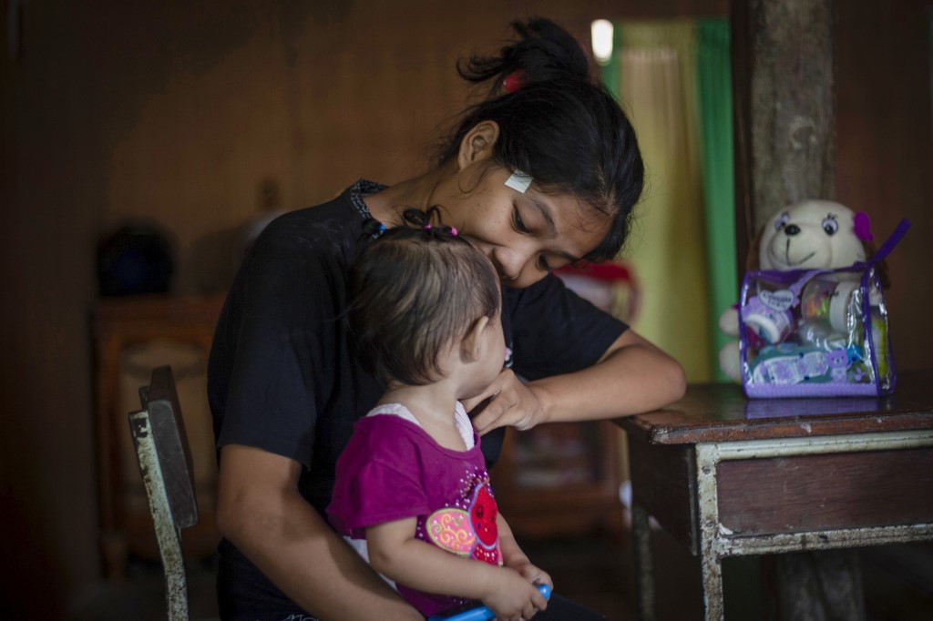 This picture taken on February 9, 2019 shows Nurlina, 19, who got married in 2017, holding her daughter in the village of Galung Lombok in West Sulawesi. Child marriage has long been common in traditional communities from the Indonesian archipelago to India, Pakistan and Vietnam, but numbers had been decreasing as charities made inroads by encouraging access to education and women's health services. YUSUF WAHIL / AFP