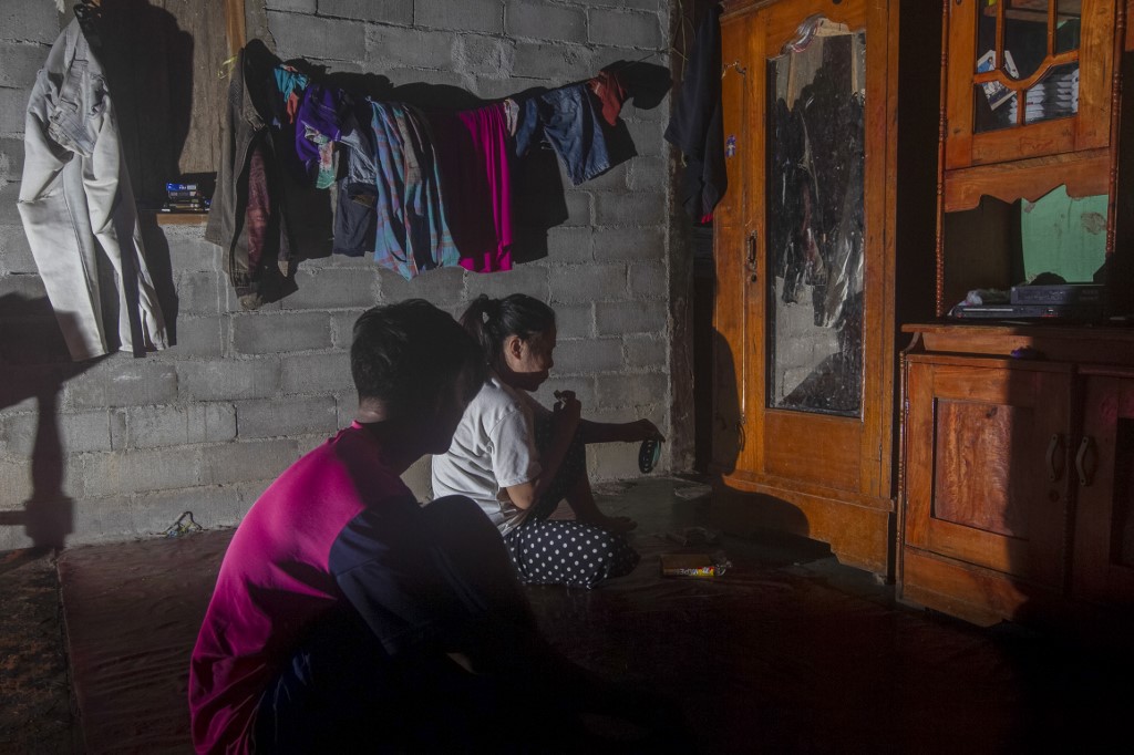 This picture taken on July 22, 2020 shows Marsuki (L) with his underage wife Imani (not her real name) watching television at their parent's house in the village of Pokkang in Mamuju, West Sulawesi. Child marriage has long been common in traditional communities from the Indonesian archipelago to India, Pakistan and Vietnam, but numbers had been decreasing as charities made inroads by encouraging access to education and women's health services. YUSUF WAHIL / AFP