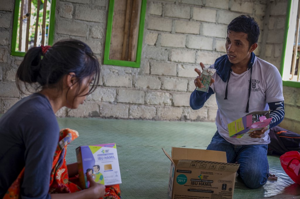This picture taken on February 11, 2019 shows Ninda (L), who is two months pregnant and married, listening to directions from a health worker at her home in the village of Pulau Karampuang in Mamuju, West Sulawesi. Child marriage has long been common in traditional communities from the Indonesian archipelago to India, Pakistan and Vietnam, but numbers had been decreasing as charities made inroads by encouraging access to education and women's health services. YUSUF WAHIL / AFP