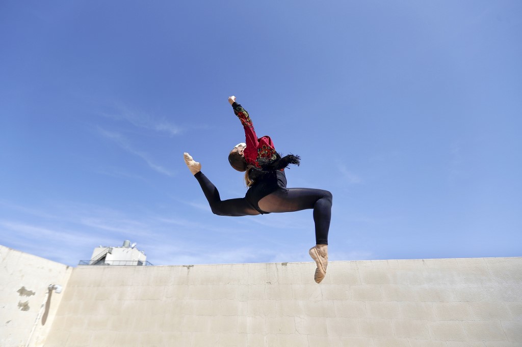 She practices while wearing a surgical mask on the roof of her apartment building in the suburb of Dekwaneh on the eastern outskirts of Lebanon's capital Beirut.