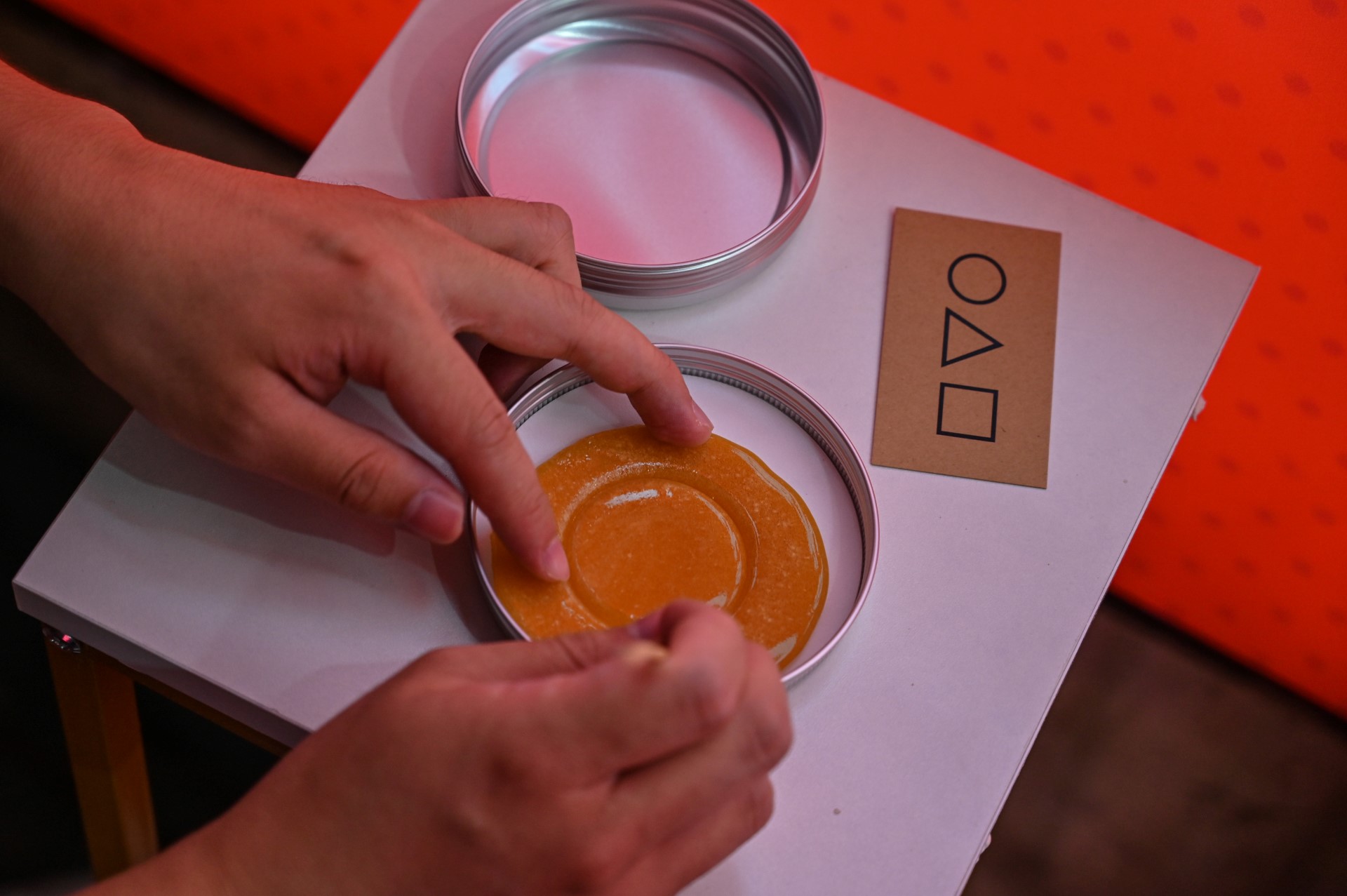 This photo taken on October 12, 2021 shows a customer cutting a dalgona, a crisp sugar candy featured in the Netflix series Squid Game, in Shanghai. AFP/File