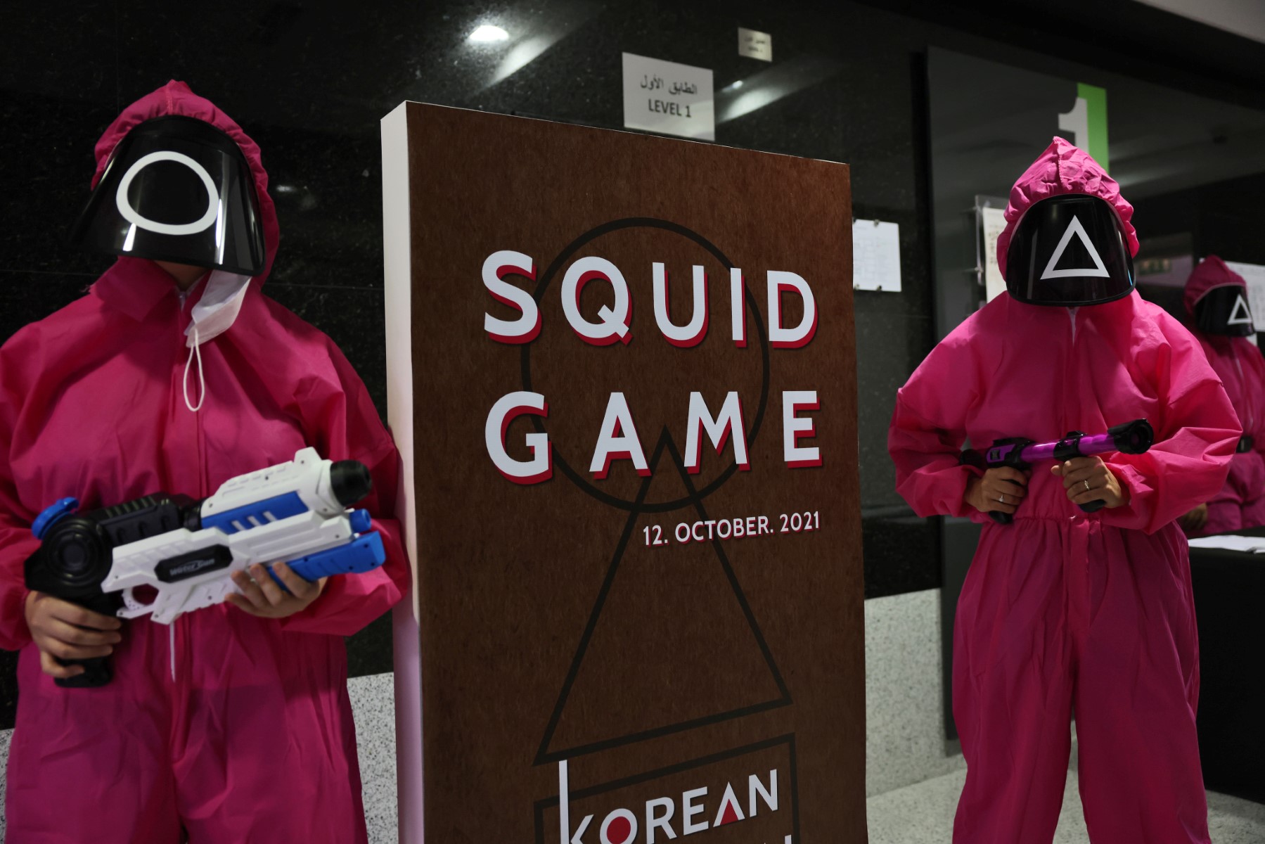 Participants take part in an event where they play the games of Netflix smash hit "Squid Game" at the Korean Cultural Centre in Abu Dhabi, on October 12, 2021. A dystopian vision of a polarised society, "Squid Game" blends a tight plot, social allegory and uncompromising violence to create the latest South Korean cultural phenomenon to go global. (Photo by Giuseppe CACACE / AFP)