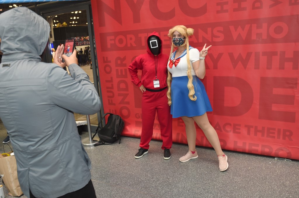 Cosplayers dressed as Squid Game and Sailor Moon pose during Day 3 of New York Comic Con 2021 at Jacob Javits Center on October 09, 2021 in New York City. Bryan Bedder/Getty Images for ReedPop/AFP