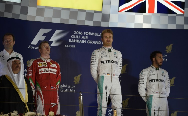 Mercedes AMG Petronas F1 Team's German driver Nico Rosberg (2nd R) celebrates on the podium after winning the Bahrain Formula 1 Grand Prix next to second placed Ferrari's Finnish driver Kimi Raikkonen (3rd L) and third placed Mercedes AMG Petronas F1 Team's British driver Lewis Hamilton (R) at the Sakhir circuit in Manama on April 3, 2016. AFP PHOTO / MOHAMMED AL-SHAIKH MOHAMMED AL-SHAIKH / AFP