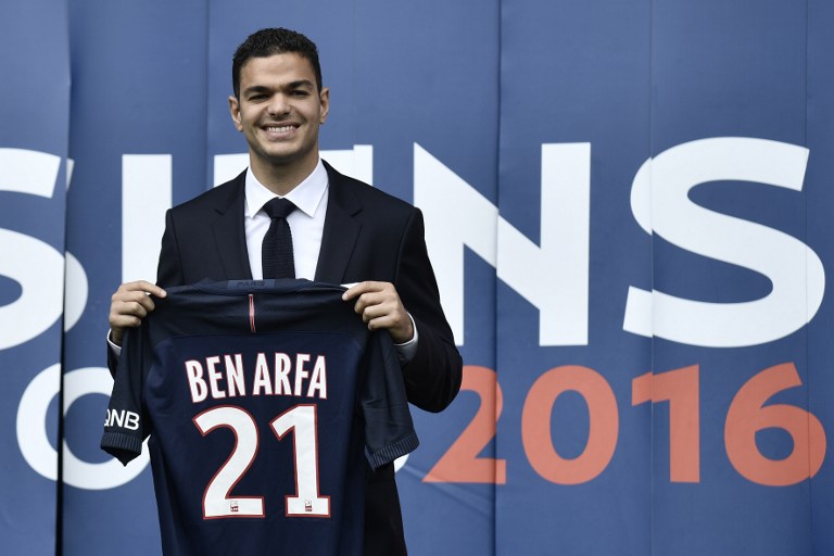 Paris Saint-Germain's new recruit French attacking midfielder Hatem Ben Arfa poses with his jersey at the Parc des Princes stadium in Paris on July 4, 2016.
