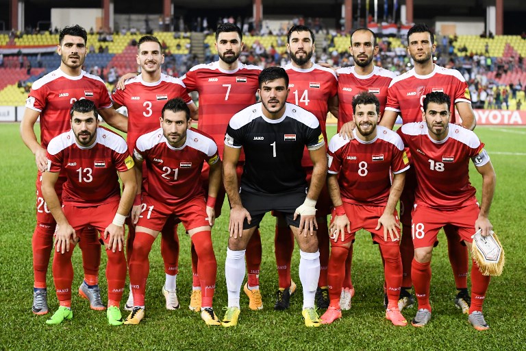 (Top row) Syria's Khaled Almbayed, Mouaiad Alajaan, Omar Khrbin, Tamer Hag Mohamad, Hadi Almasri, Omar Alsoma, (bottom row) Yousef Kalfa, Fahad Youssef, Ibrahim Alma, Mahmoud al-Mawas and Zaher Almedani pose for a team photograph before the 2018 World Cup qualifying football match between Syria and Australia at the Hang Jebat Stadium in Malacca on October 5, 2017.
