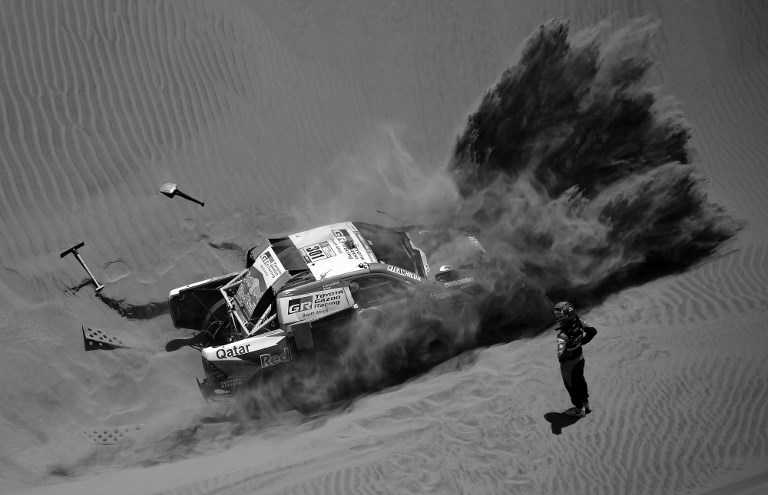 Toyota's driver Nasser Al-Attiyah of Qatar and his co-driver Matthieu Baumel of France get stuck in the sand dunes during Stage 4 of the Dakar 2018, in and around San Juan De Marcona, Peru, on January 9, 2018. FRANCK FIFE / AFP