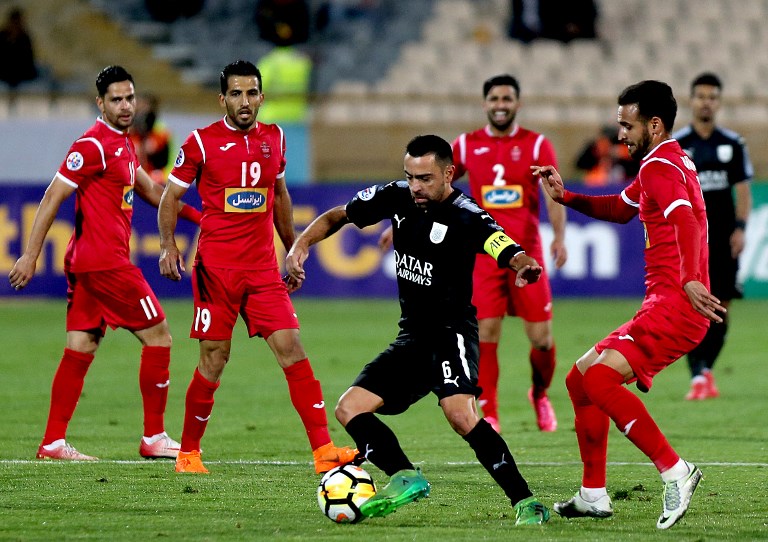 Al-Sadd's Xavier Hernandez (C) dribbles the ball as Persepolis' Ahmad Noorollahi (R) defends during the AFC Champions League match between al-Sadd and Persepolis at the Azadi Stadium in Tehran on April 16, 2018.