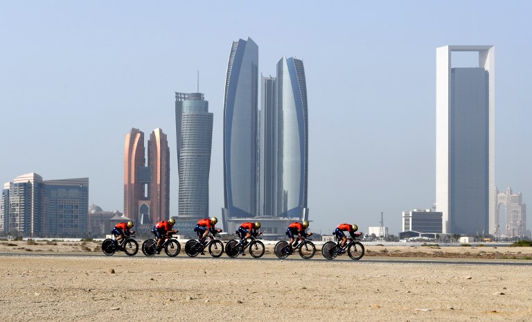 Team Bahrain Merida competes during the first stage of the UAE tour in Abu Dhabi on February 24, 2019. GIUSEPPE CACACE / AFP