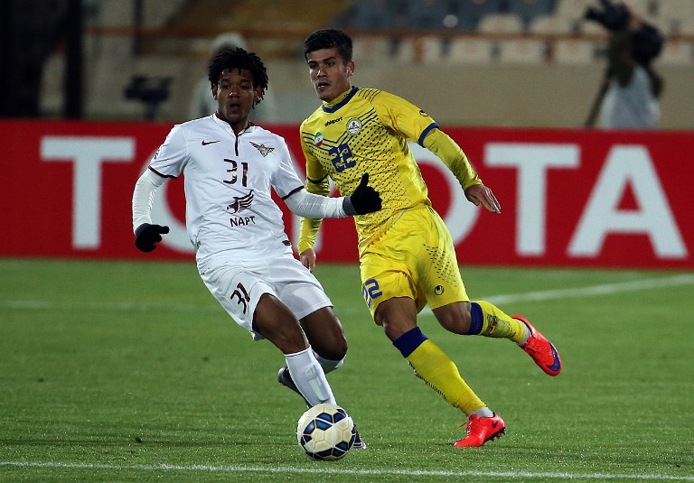 Naft Tehran's Reza Aliyari (L) and Qatar's El Jaish player Ricardo Romarinho chase the ball during AFC Champions League 3rd qualifying round play-off football match at the Azadi stadium in Tehran on February 9, 2016.