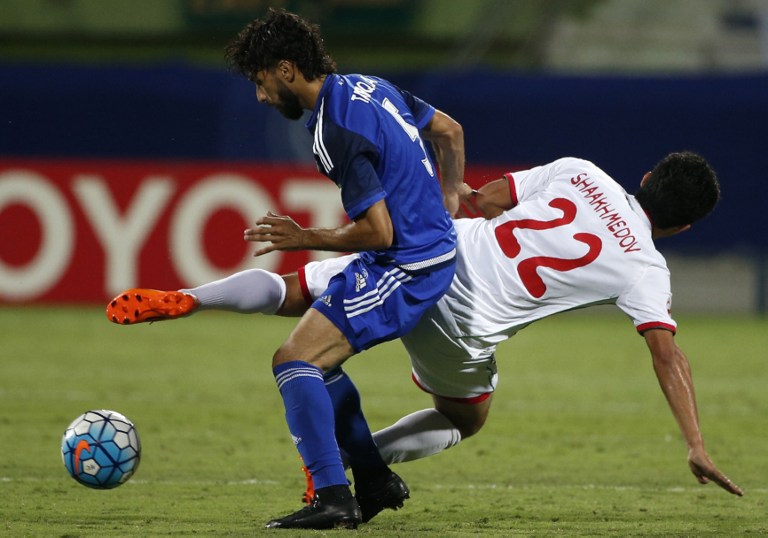 UAE's Al-Nasr club player Tariq Ahmed (L) tries to control the ball as Uzbekistan's Lokomotiv club player Sanjar Shaakhmedov falls to the ground during their Asian Champions League (AFC) group A football match at the Rashid Al-Maktoum Stadium in Dubai on April 20, 2016. KARIM SAHIB / AFP