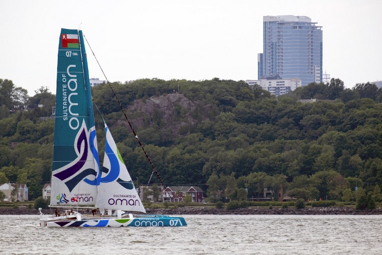 The Sultanate of Oman's Musandam-Oman Sail (Ultimate class) sails on St. Lawrence River on July 13, 2016 for the Transat Quebec Saint-Malo race in Quebec City.