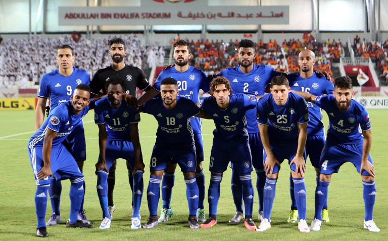 Al-Nasr's starting eleven pose for a group picture during the Asian Champions League quarter-final football match between Qatar's El-Jaish and UAE's Al-Nasr at Abdullah Bin Khalifa Stadium in Doha on August 24, 2016.
