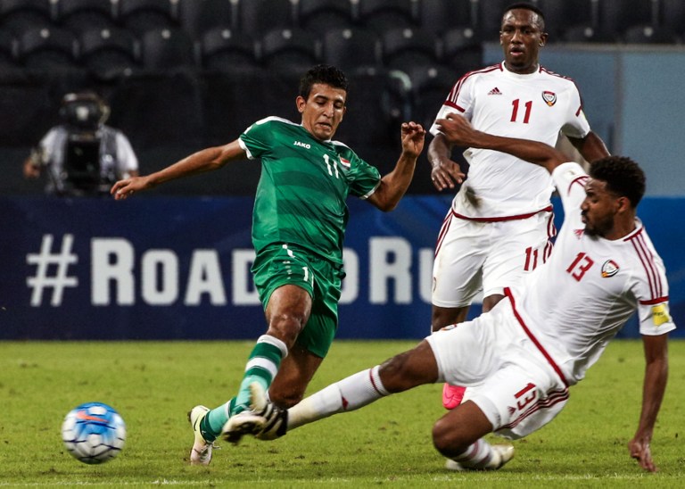 Iraq's Amjed Attwan (L) is tackled by UAE's Khamis Esmaeel during the 2018 World Cup qualifying football match between Iraq and the United Arab Emirates at Sheikh Mohammed Bin Zayed stadium in Abu Dhabi on November 15, 2016.
