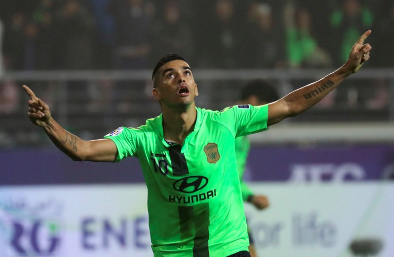 Jeonbuk Hyundai Motors' Leonardo Rodrigues Pereira celebrates his 2nd goal against Al Ain during the AFC Champions League Final 1st Leg football match in Jeonju on November 19, 2016. Brazilian forward Leonardo hit a blistering second-half double as Jeonbuk Hyundai Motors came from behind to beat Al Ain 2-1 and grab the initiative in the two-legged AFC Champions League final on November 19.