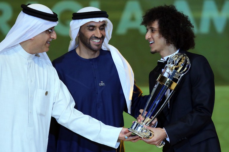 Shaikh Salman bin Ebrahim Al Khalifa (L), President of the Asian Football Confederation (AFC), and Sheikh Nahyan Bin Zayed Al Nahyan (C), Chairman of the Abu Dhabi Sports Council, present Omar Abdulrahman (R) with a trophy after being named the AFC Men's Footballer of the Year during the Asian Football Confederation's Annual Awards ceremony on December 1, 2016 in Abu Dhabi.