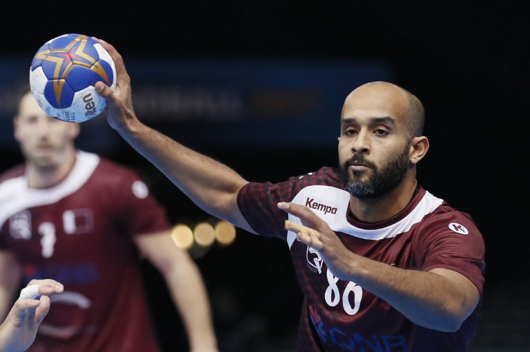 Qatar's centre back Mahmoud Hassaballa passes the ball during the 25th IHF Men's World Championship 2017 Group D handball match Qatar vs Argentina on January 17, 2017 at the AccorHotels Arena in Paris.