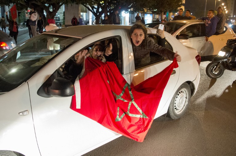 Moroccan supporters celebrate a victory after the end of the 2017 AFCON group C football match against the Ivory Coast in Rabat on January 24, 2017. The Ivory Coast were sent packing after losing 1-0. A brilliant Rachid Alioui goal gave Morocco the victory as the Atlas Lions marched on to the quarter-finals.