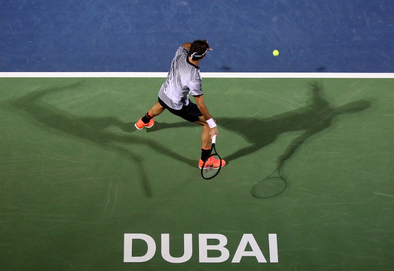 Roger Federer of Switzerland returns the ball to France's Benoit Paire during their ATP tennis match as part of the Dubai Duty Free Championships on February 27, 2017. MAHMOUD KHALED / AFP