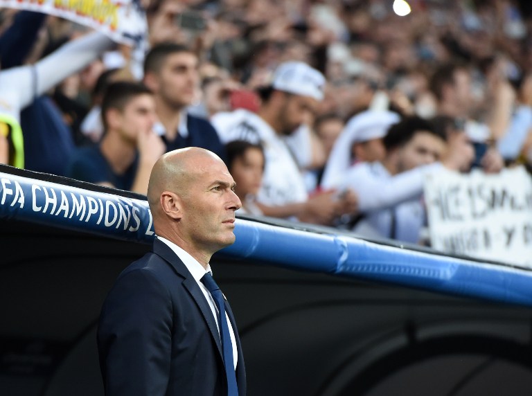 Real Madrid's French coach Zinedine Zidane waits prior the UEFA Champions League quarterfinal second leg football match Real Madrid vs FC Bayern Munich at the Santiago Bernabeu stadium in Madrid, Spain, on April 18, 2017.