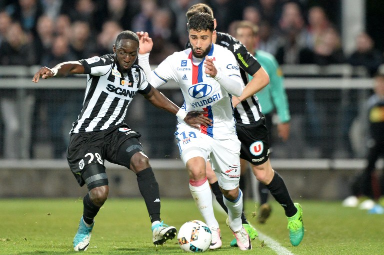 Angers' French defender Issa Cissokho (L) vies for the ball with Lyon's French midfielder Nabil Fekir (R) during the French L1 football match between Angers (SCO) and Lyon (OL) at Raymond-Kopa Stadium in Angers on April 28, 2017. JEAN-FRANCOIS MONIER / AFP