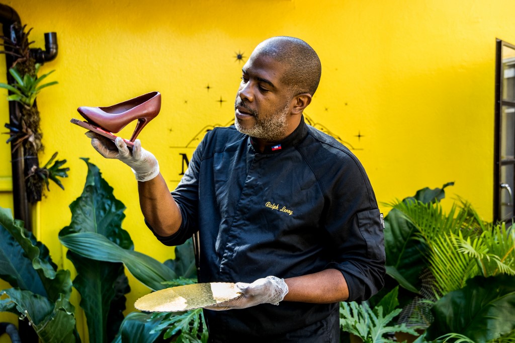 Ralph Leroy, chocolate maker, entrepreneur and chocolate sculptor, poses with one of his emblematic creations, a shoe in the workshops of Makaya Chocolat on December 23, 2020 in Petionville, Haiti. Although small in the face of South America's giants, Haiti is slowly developing its cocoa industry to ensure better incomes for thousands of modest farmers and to end the stereotype of gastronomic art known as the domain of wealthy countries. Valerie Baeriswyl / AFP