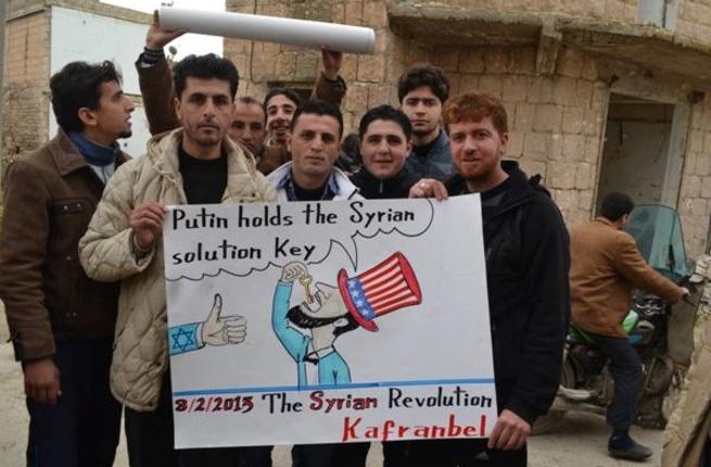 Always sarcastic and sometimes dark, their messages to the outside world show their astute understanding of the powers at play in the Syrian war. Kafranbel activists not only react to the war within but also to the news stories around them.