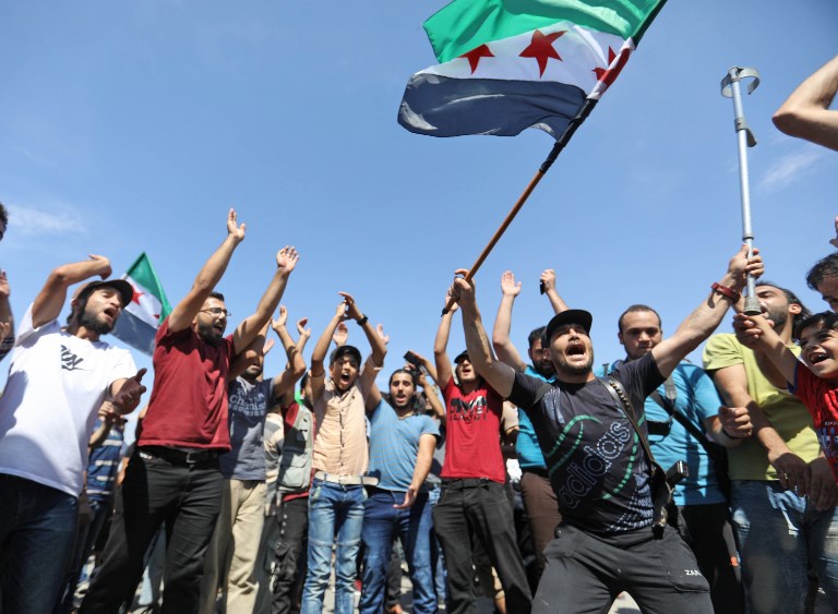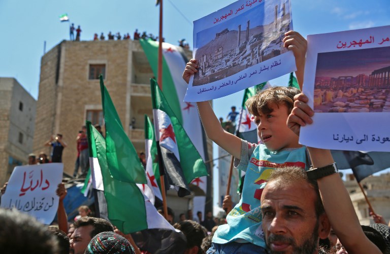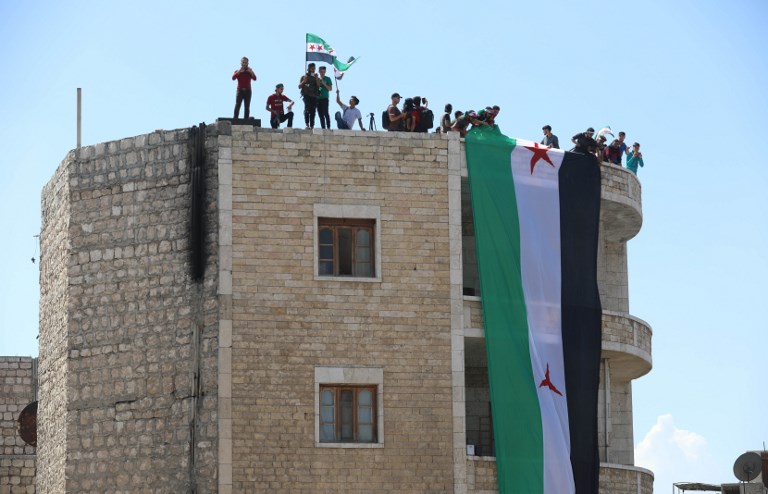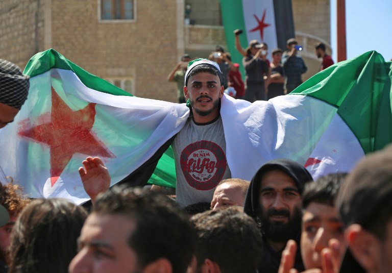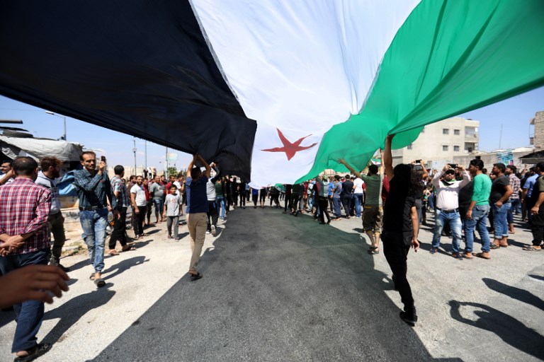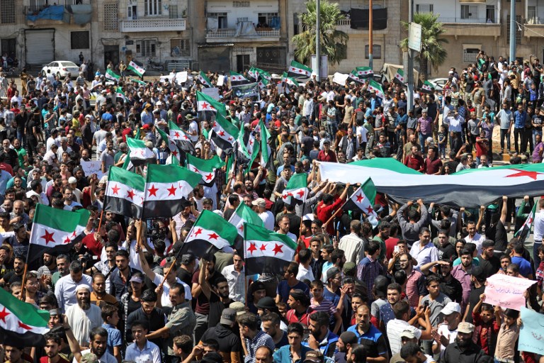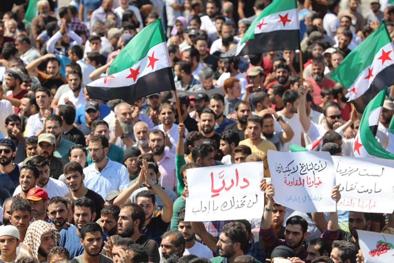 Thousands of people staged street protests in Idlib on September 7, 2018 waving the opposition flag to protest the strikes and to call for international protection.