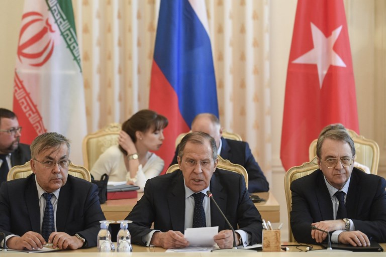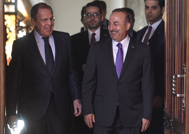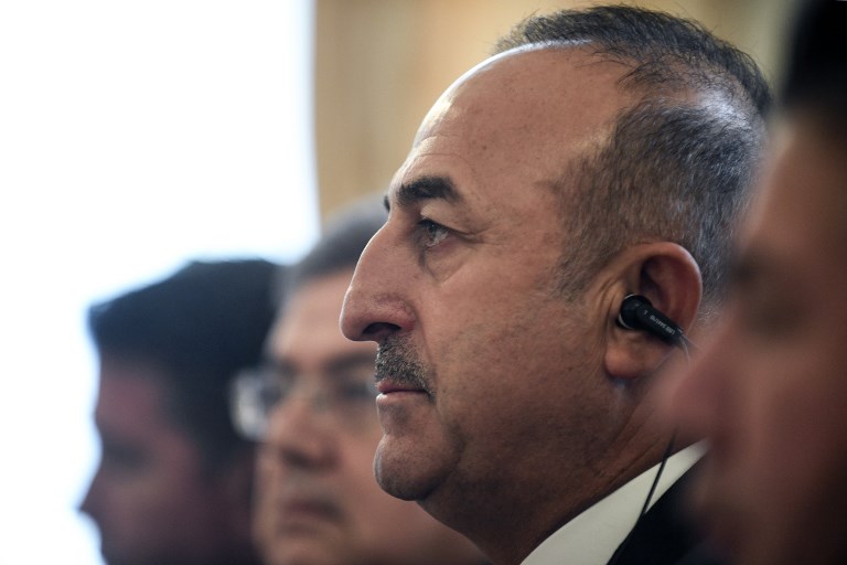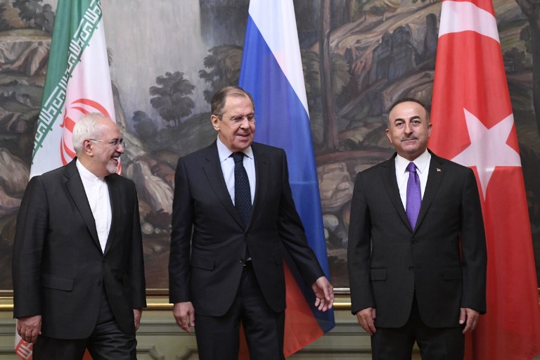 Turkey's foreign minister discussed the latest situation in Syria with his Iranian and Russian counterparts in Moscow on Saturday, according to his Twitter post.